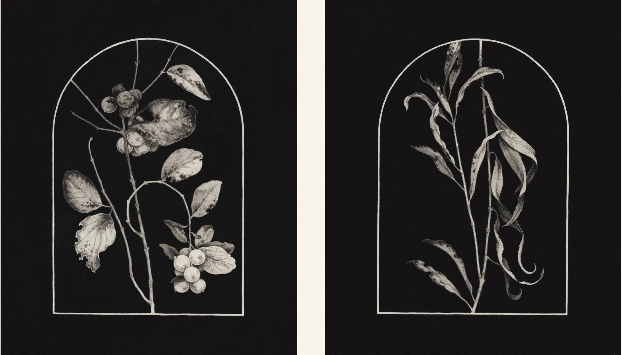 “Drought” is not a celebration or idealization of Nature, but work born of anxious feelings in worsening times. It is an attempt at depicting things how they really are, in spite of our optimistic attempts to perceive them otherwise: broken, stitched together, half-remembered, pieces lost along the way. The unpredictable sunprinting process of cyanotype has been used to intentionally degrade the delicately illustrated imagery, with fragments of replicated images collaged together into a fractured view of the originals. Waterbirds and their remnant habitats dominate the scenes, but water itself is conspicuously absent. In contrast, the botanical “Omens” are painted in stark clarity, a sampling of the many manifestations of drought on Oregon’s plant life witnessed in the past year.
